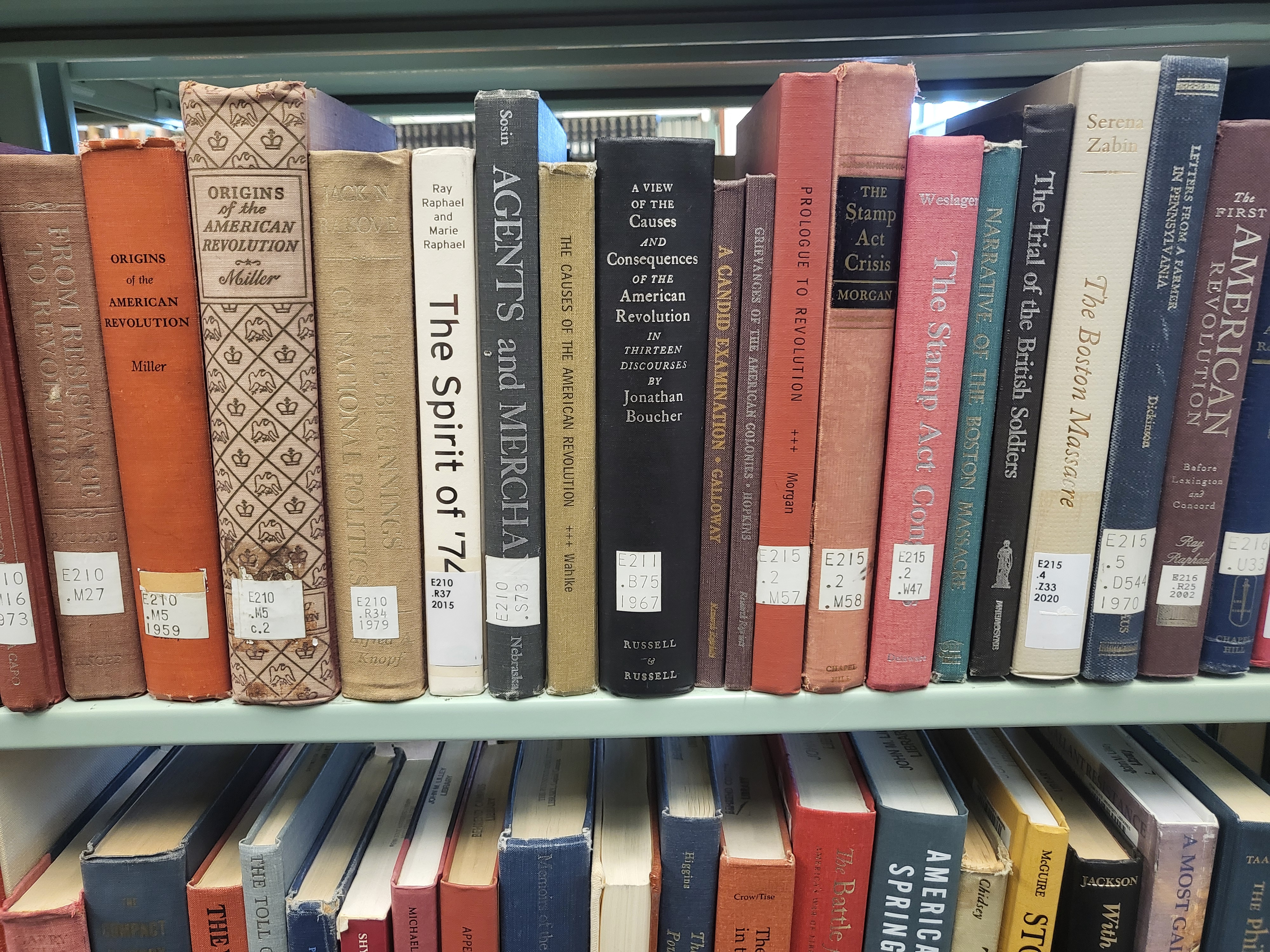 This bookshelf contains information about Colonial America, such as the Boston Tea Party and the American Revolution